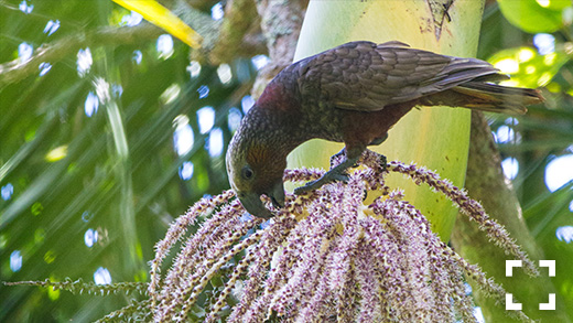 The nīkau grows up to 15 metres tall and fruits from February to November. The fruit is a favourite of the kākā (a native parrot), who also help pollinate the flowers with its brush tongue.